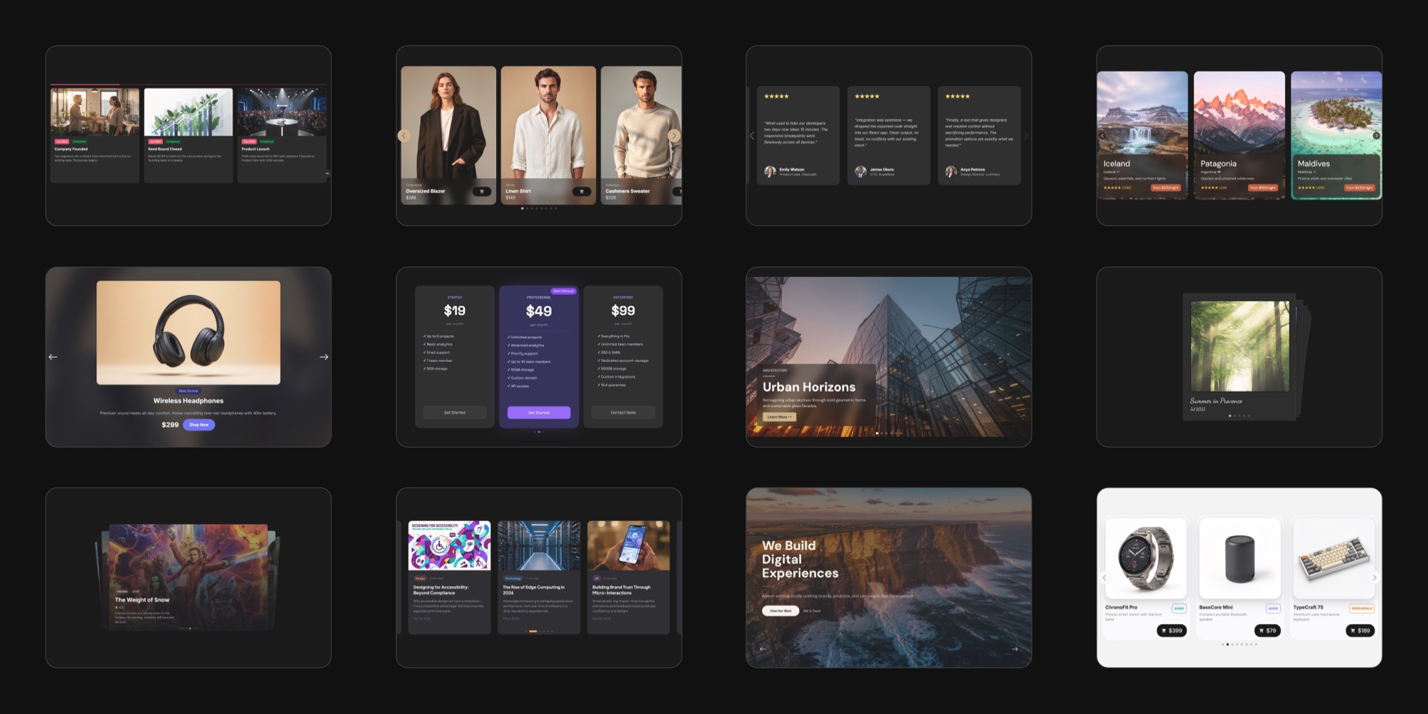 Building a slider from scratch is powerful - but sometimes you just want a head start. Today we are shipping 25 use case templates covering the most common slider patterns on the web. Each one is a fully designed, production-ready starting point that you can customize visually and export to React, Vue, Next.js, HTML, Web Components, or Webflow.