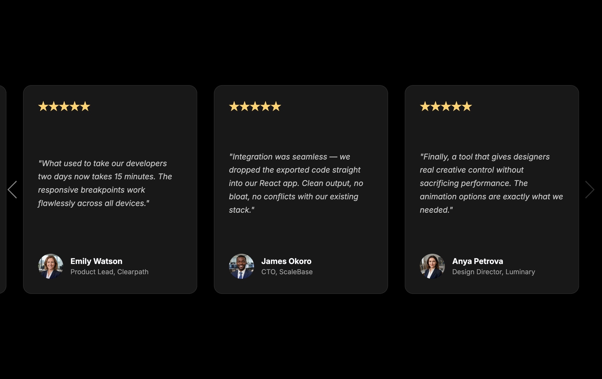Each card displays five gold stars at the top, an italic quote in the center, the reviewer's name and title below, and a circular avatar photo at the bottom. Three cards are visible at once on desktop, and side arrows let visitors browse through additional reviews at their own pace. The dark aesthetic works especially well on landing pages, SaaS marketing sites, and portfolios where a premium, modern feel matters.